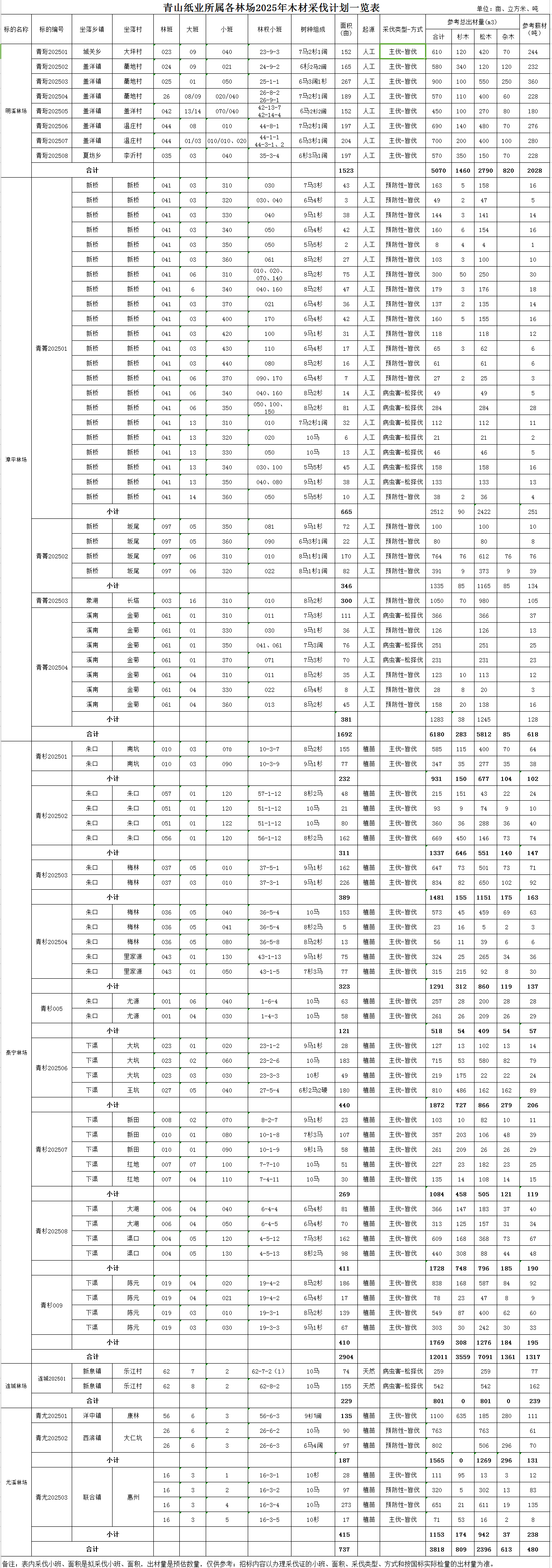 2.1自產自銷木材地點(詳見附表):青山紙業所屬的福建省明溪青珩林場有限責任公司、福建省泰寧青杉林場有限責任公司、福建省漳平青菁林場有限責任公司、福建省青山紙業股份有限公司尤溪林業分公司、福建省連城青山林場有限公司(以下簡稱青山紙業所屬各林業子公司)經營區。